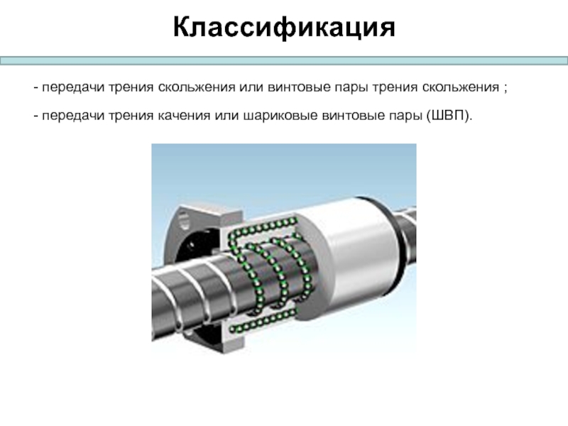 Классификация- передачи трения скольжения или винтовые пары трения скольжения ;- передачи трения качения или шариковые винтовые пары