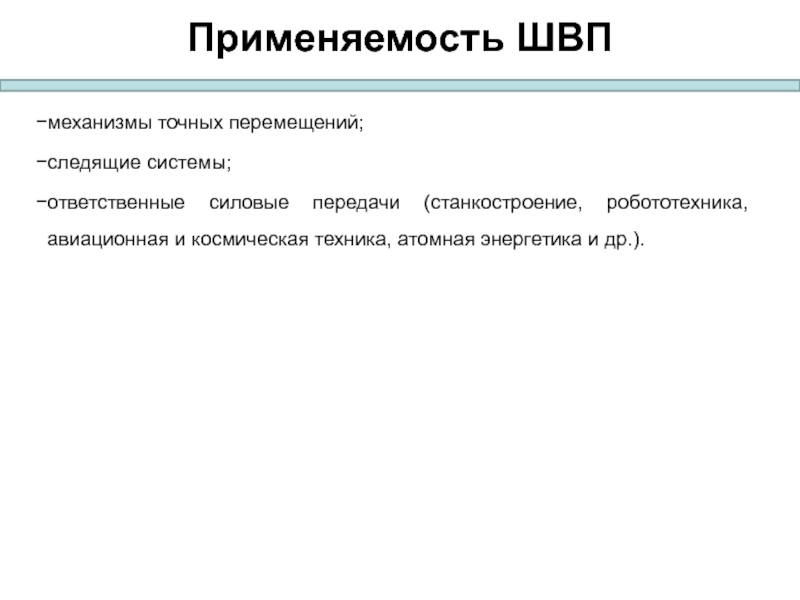 Применяемость ШВПмеханизмы точных перемещений;следящие системы;ответственные силовые передачи (станкостроение, робототехника, авиационная и космическая техника, атомная энергетика и др.).