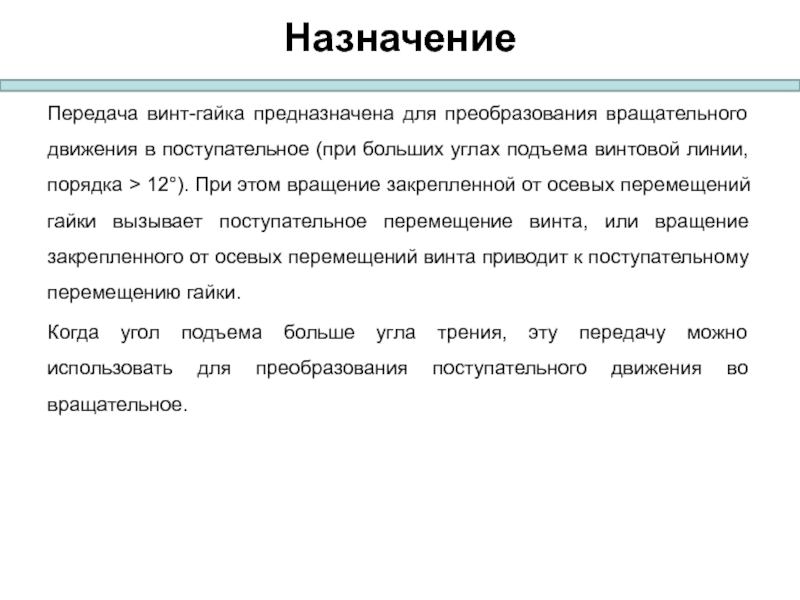 НазначениеПередача винт-гайка предназначена для преобразования вращательного движения в поступательное (при больших углах подъема винтовой линии, порядка >
