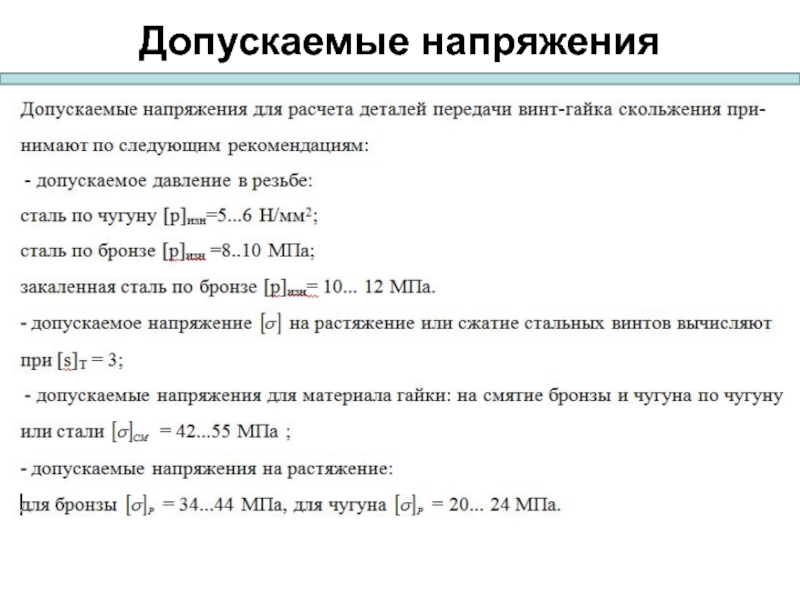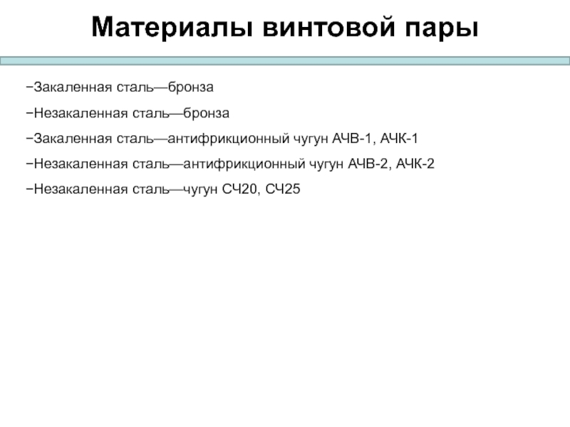 Материалы винтовой парыЗакаленная сталь—бронзаНезакаленная сталь—бронзаЗакаленная сталь—антифрикционный чугун АЧВ-1, АЧК-1Незакаленная сталь—антифрикционный чугун АЧВ-2, АЧК-2Незакаленная сталь—чугун СЧ20, СЧ25