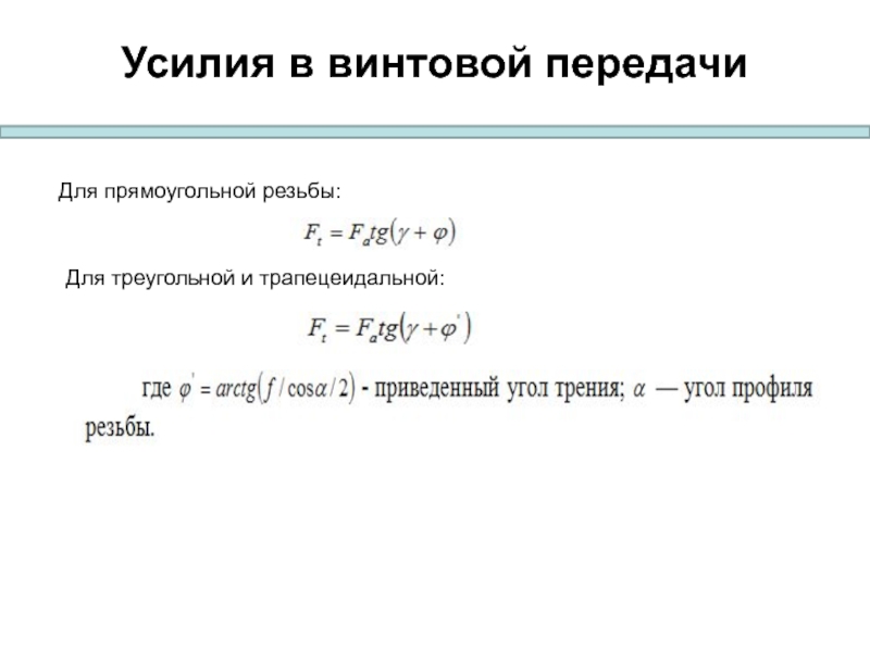 Усилия в винтовой передачиДля прямоугольной резьбы:Для треугольной и трапецеидальной: