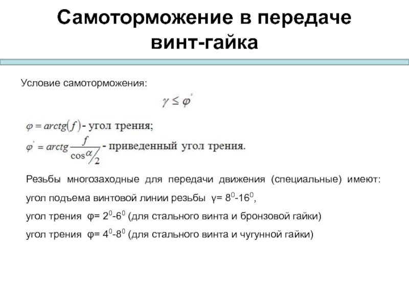 Самоторможение в передаче  винт-гайкаУсловие самоторможения:Резьбы многозаходные для передачи движения (специальные) имеют: угол подъема винтовой линии резьбы