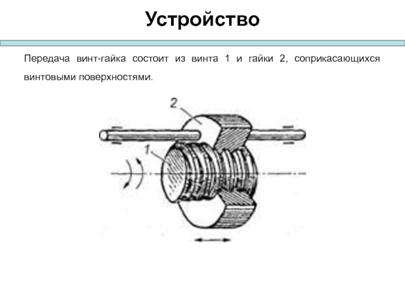 УстройствоПередача винт-гайка состоит из винта 1 и гайки 2, соприкасающихся винтовыми поверхностями.