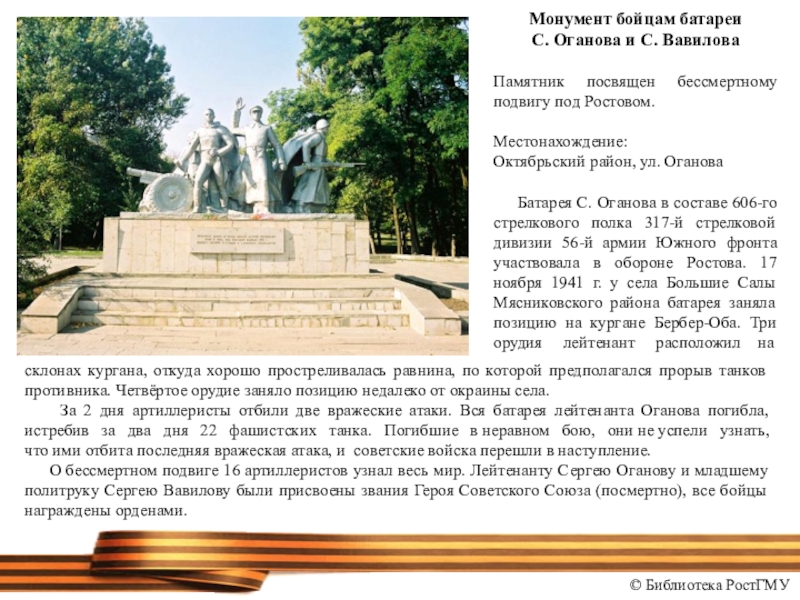 О бессмертном подвиге 16 артиллеристов узнал весь мир. Лейтенанту Сергею Оганову и младшему политруку Сергею Вавилову были присвоены звания Героя Советского Союза (посмертно), все бойцы награждены орденами.
