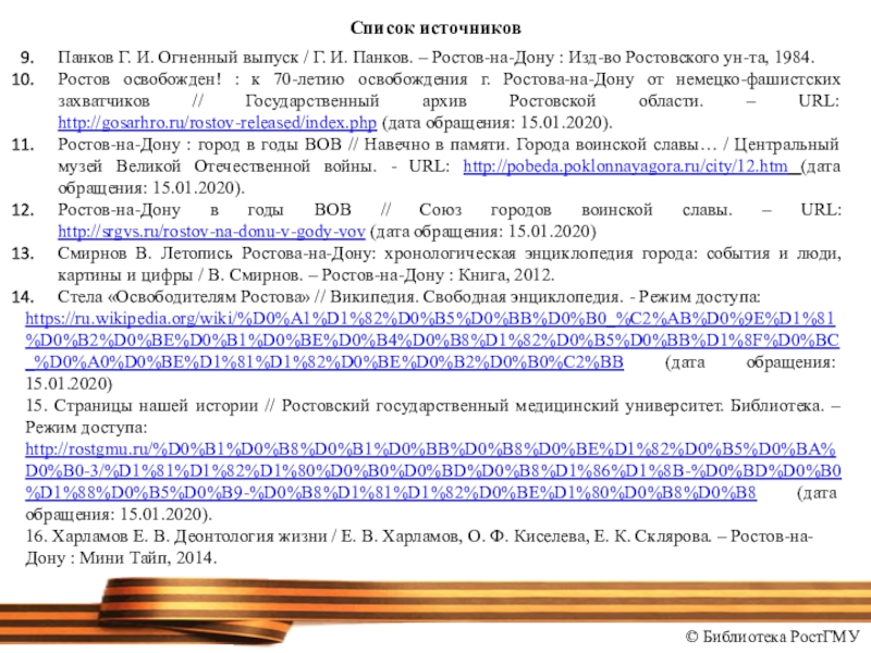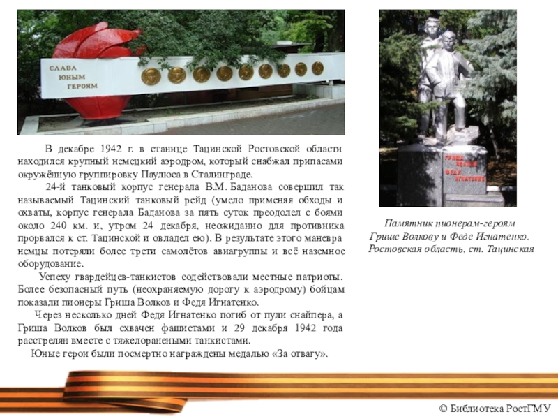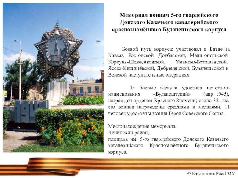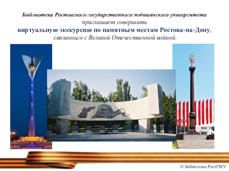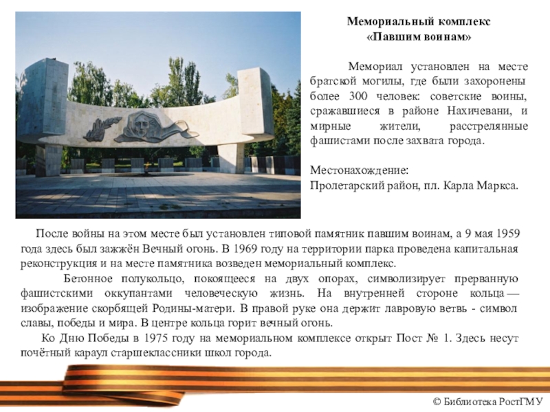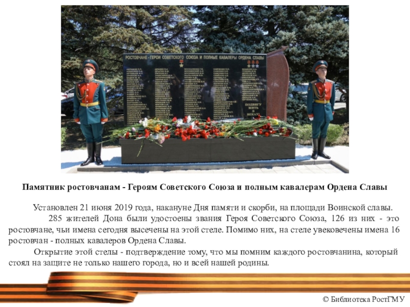 Установлен в честь погибших на фронтах Великой Отечественной войны выпускников и сотрудников РостГМУ.