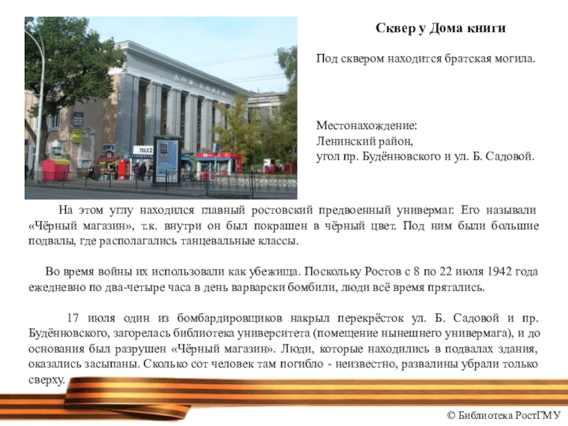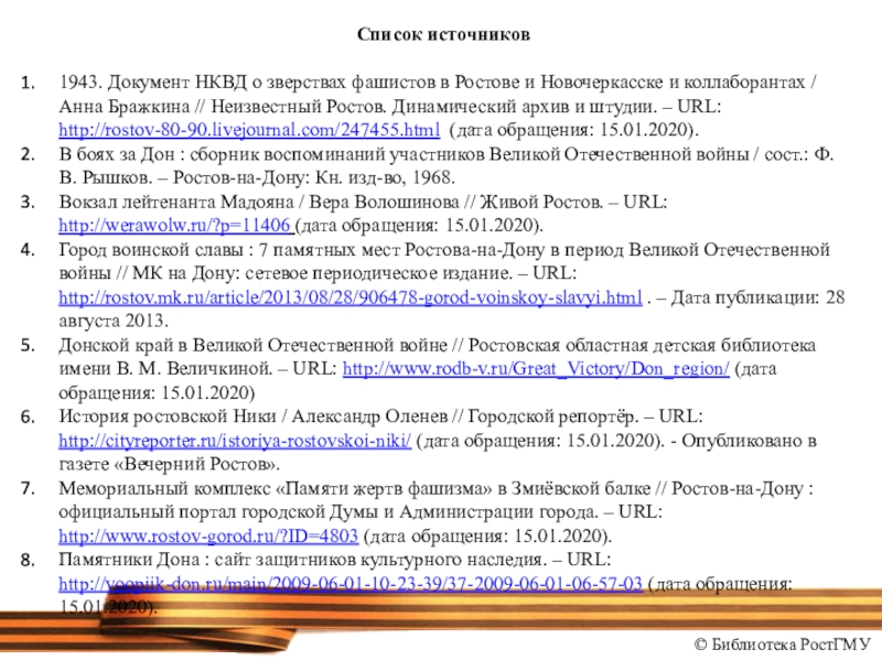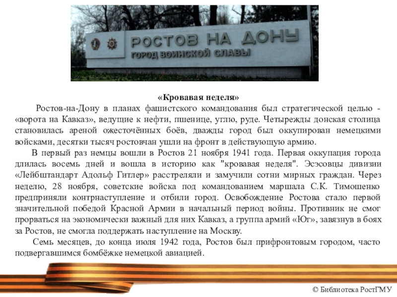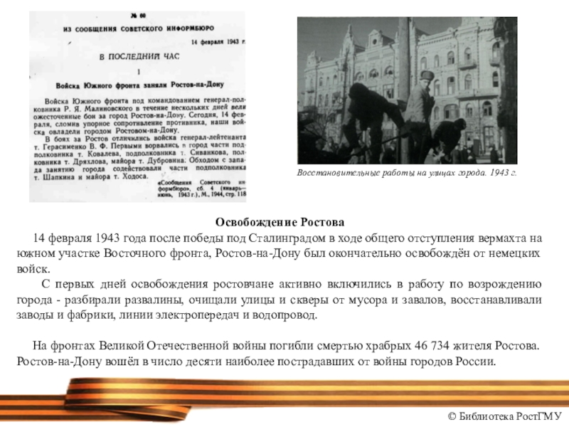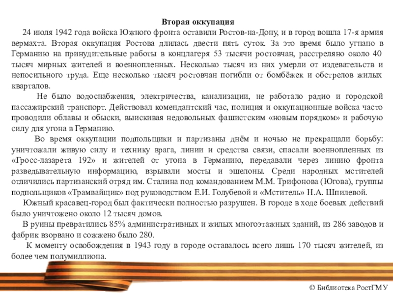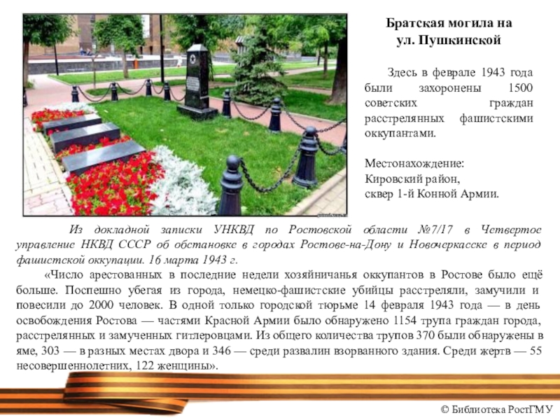 «Число арестованных в последние недели хозяйничанья оккупантов в Ростове было ещё больше. Поспешно убегая из города, немецко-фашистские убийцы расстреляли, замучили и повесили до 2000 человек. В одной только городской тюрьме 14 февраля 1943 года — в день освобождения Ростова — частями Красной Армии было обнаружено 1154 трупа граждан города, расстрелянных и замученных гитлеровцами. Из общего количества трупов 370 были обнаружены в яме, 303 — в разных местах двора и 346 — среди развалин взорванного здания. Среди жертв — 55 несовершеннолетних, 122 женщины».