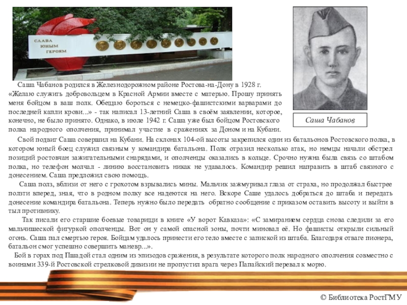 Свой подвиг Саша совершил на Кубани. На склонах 104-ой высоты закрепился один из батальонов Ростовского полка, в котором юный боец служил связным у командира батальона. Полк отразил несколько атак, но немцы начали обстрел позиций ростовчан зажигательными снарядами, и ополченцы оказались в кольце. Срочно нужна была связь со штабом полка, но телефон молчал - линию восстановить никак не удавалось. Командир решил направить в штаб связного с донесением. Саша предложил свою помощь.