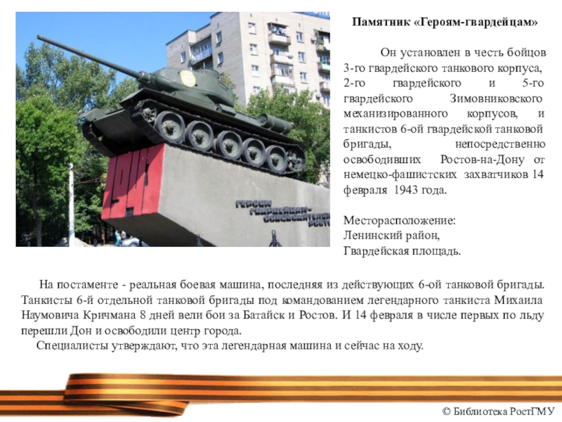 Он установлен в честь бойцов 3-го гвардейского танкового корпуса, 2-го гвардейского и 5-го гвардейского Зимовниковского механизированного корпусов, и танкистов 6-ой гвардейской танковой бригады, непосредственно освободивших Ростов-на-Дону от немецко-фашистских захватчиков 14 февраля 1943 года.