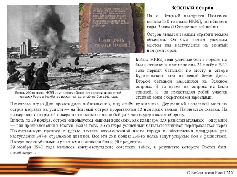 Бойцы НКВД вели уличные бои в городе, но были оттеснены противником. 21 ноября 1941 года первый батальон по мосту в створе Буденновского шел на левый берег Дона. Второй батальон закрепился на Зеленом острове. В то время на острове не было тополей, и он представлял собой участок степной зоны с береговыми зарослями.