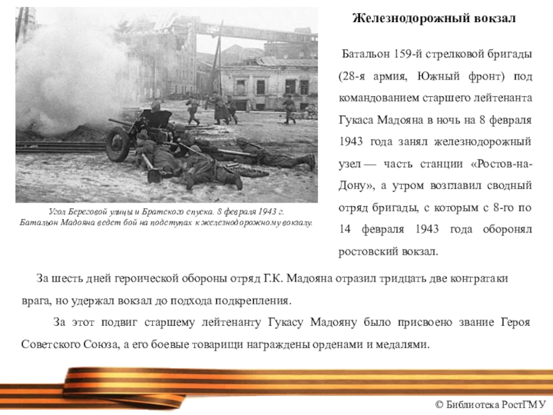Батальон 159-й стрелковой бригады (28-я армия, Южный фронт) под командованием старшего лейтенанта Гукаса Мадояна в ночь на 8 февраля 1943 года занял железнодорожный узел — часть станции «Ростов-на-Дону», а утром возглавил сводный отряд бригады, с которым с 8-го по 14 февраля 1943 года оборонял ростовский вокзал.