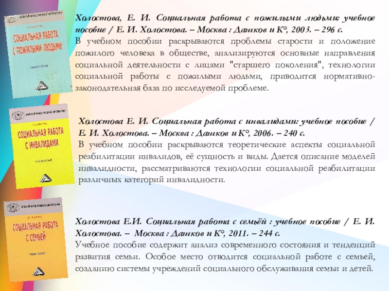 Холостова Е. И. Социальная работа с инвалидами: учебное пособие / Е. И. Холостова. – Москва : Дашков и К°, 2006. – 240 с.