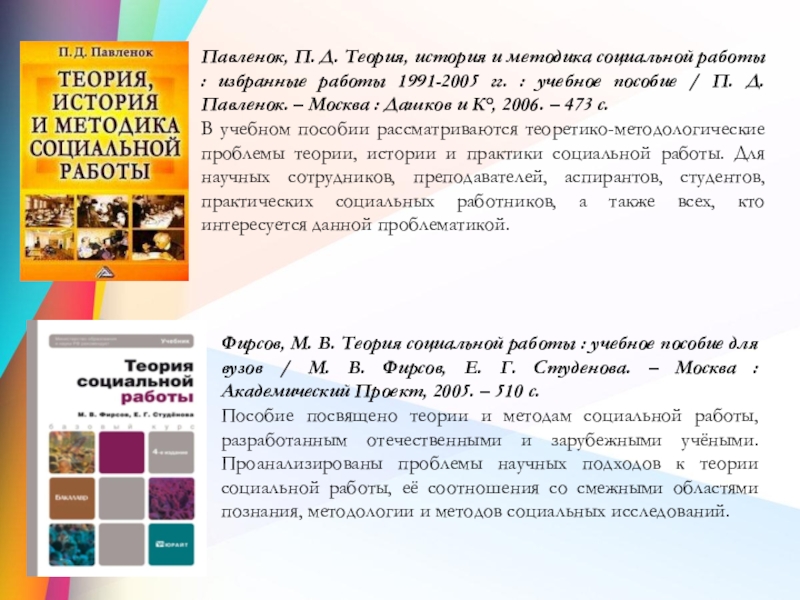 Павленок, П. Д. Теория, история и методика социальной работы : избранные работы 1991-2005 гг. : учебное пособие / П. Д. Павленок. – Москва : Дашков и К°, 2006. – 473 с.