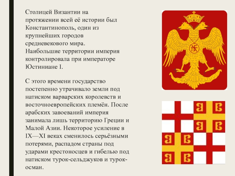 С этого времени государство постепенно утрачивало земли под натиском варварских королевств и восточноевропейских племён. После арабских завоеваний империя занимала лишь территорию Греции и Малой Азии. Некоторое усиление в IX—XI веках сменилось серьёзными потерями, распадом страны под ударами крестоносцев и гибелью под натиском турок-сельджуков и турок-осман.