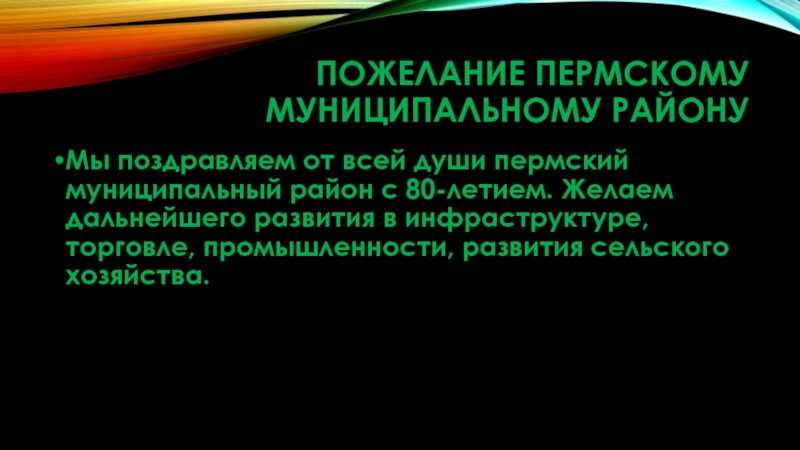 Пожелание Пермскому муниципальному районуМы поздравляем от всей души пермский муниципальный район с 80-летием. Желаем дальнейшего развития в