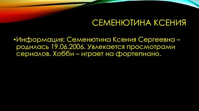 Семенютина Ксения Информация: Семенютина Ксения Сергеевна – родилась 19.06.2006. Увлекается просмотрами сериалов. Хобби – играет на фортепиано.