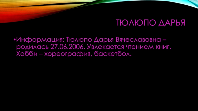 Тюлюпо ДарьяИнформация: Тюлюпо Дарья Вячеславовна – родилась 27.06.2006. Увлекается чтением книг. Хобби – хореография, баскетбол.