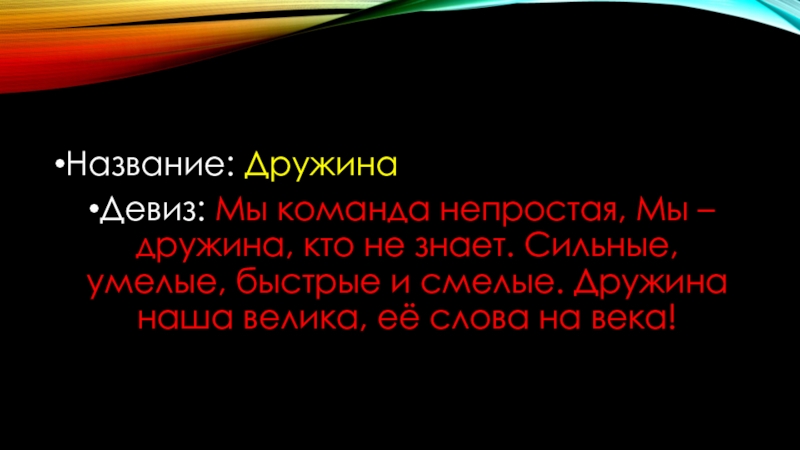 Девиз: Мы команда непростая, Мы – дружина, кто не