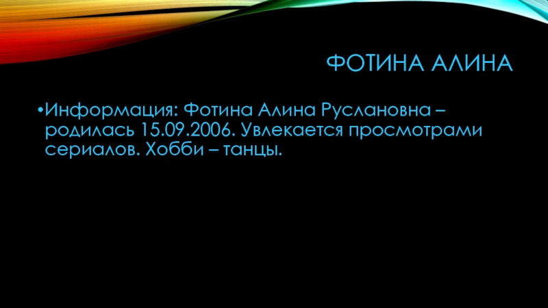 Информация: Фотина Алина Руслановна – родилась 15.09.2006. Увлекается просмотрами