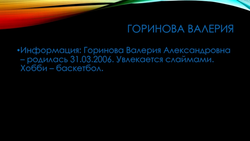 Горинова ВалерияИнформация: Горинова Валерия Александровна – родилась 31.03.2006. Увлекается слаймами. Хобби – баскетбол.