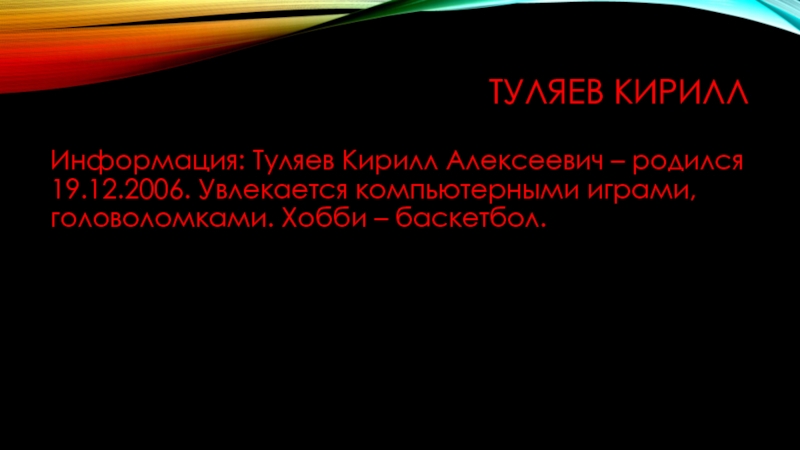 Информация: Туляев Кирилл Алексеевич – родился 19.12.2006. Увлекается компьютерными
