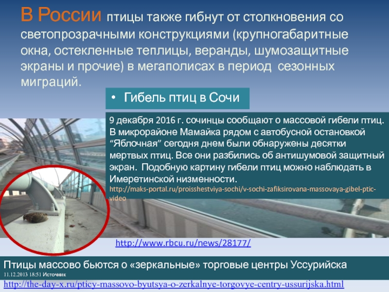 9 декабря 2016 г. сочинцы сообщают о массовой гибели птиц. В микрорайоне Мамайка рядом с автобусной остановкой “Яблочная” сегодня днем были обнаружены десятки мертвых птиц. Все они разбились об антишумовой защитный экран. Подобную картину гибели птиц можно наблюдать в Имеретинской низменности.