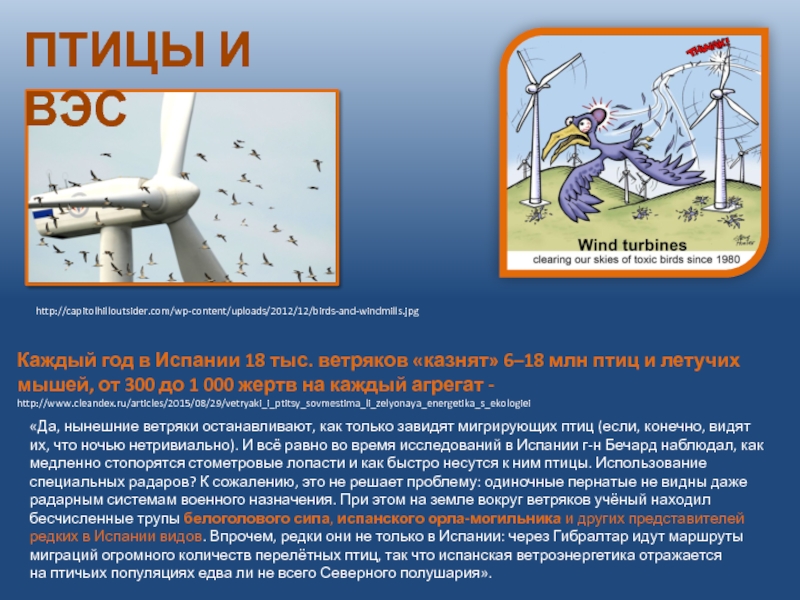 «Да, нынешние ветряки останавливают, как только завидят мигрирующих птиц (если, конечно, видят их, что ночью нетривиально). И всё равно во время исследований в Испании г-н Бечард наблюдал, как медленно стопорятся стометровые лопасти и как быстро несутся к ним птицы. Использование специальных радаров? К сожалению, это не решает проблему: одиночные пернатые не видны даже радарным системам военного назначения. При этом на земле вокруг ветряков учёный находил бесчисленные трупы белоголового сипа, испанского орла-могильника и других представителей редких в Испании видов. Впрочем, редки они не только в Испании: через Гибралтар идут маршруты миграций огромного количеств перелётных птиц, так что испанская ветроэнергетика отражается на птичьих популяциях едва ли не всего Северного полушария».