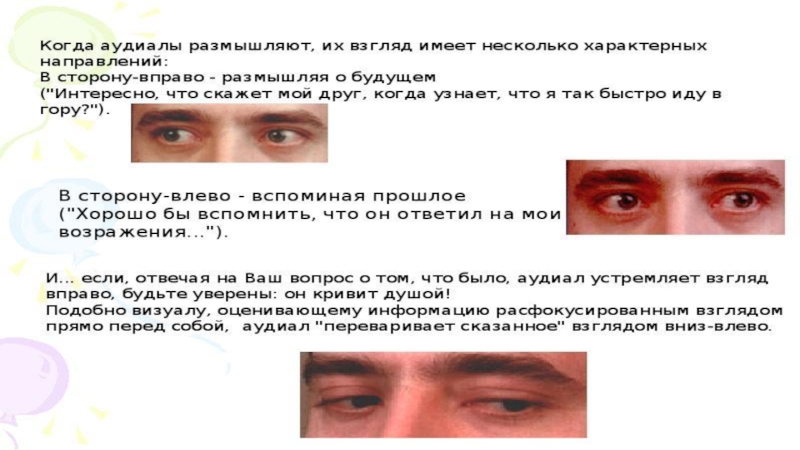 Если во время разговора следить за движением глаз собеседника, можно точно определить его тип мышления. «Ключи глазного