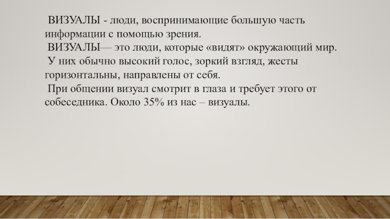 ВИЗУАЛЫ - люди, воспринимающие большую часть информации с помощью зрения. ВИЗУАЛЫ— это люди, которые «видят» окружающий мир.