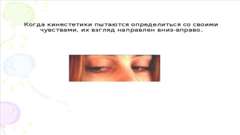 «чувствуют» окружающий мир. Люди этой категории не умеют скрывать свои чувства, их выдают глаза, поэтому они часто их опускают. Ответы на вопросы просты, прямолинейны. Решения они принимают, опираясь на свои чувства. Среди населения кинестетики составляют 40%.