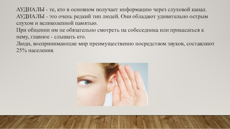 Слайд 4АУДИАЛЫ - те, кто в основном получает информацию через слуховой