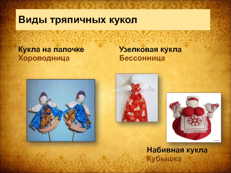 Слайд 9Виды тряпичных кукол