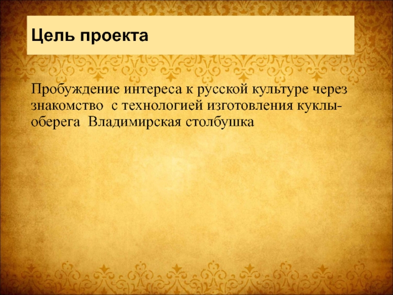 Цель проектаПробуждение интереса к русской культуре через знакомство с технологией изготовления куклы-оберега Владимирская столбушка