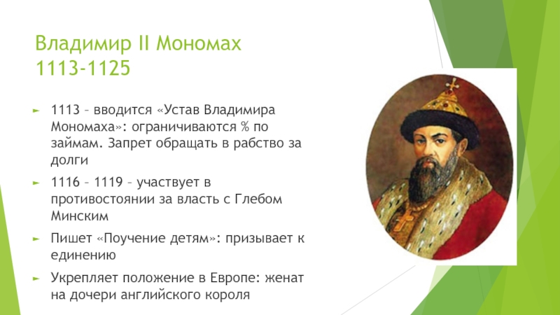 Владимир II Мономах 1113-11251113 – вводится «Устав Владимира Мономаха»: ограничиваются % по займам. Запрет обращать в рабство