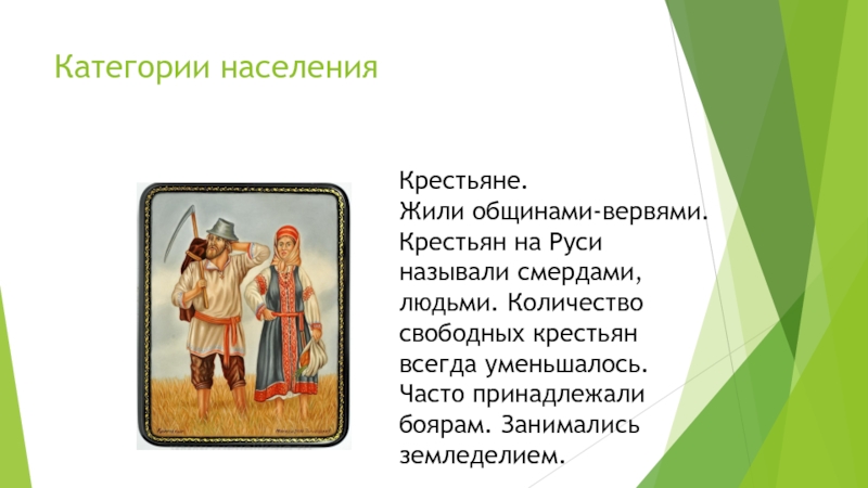 Категории населенияКрестьяне.Жили общинами-вервями. Крестьян на Руси называли смердами, людьми. Количество свободных крестьян всегда уменьшалось. Часто принадлежали боярам.