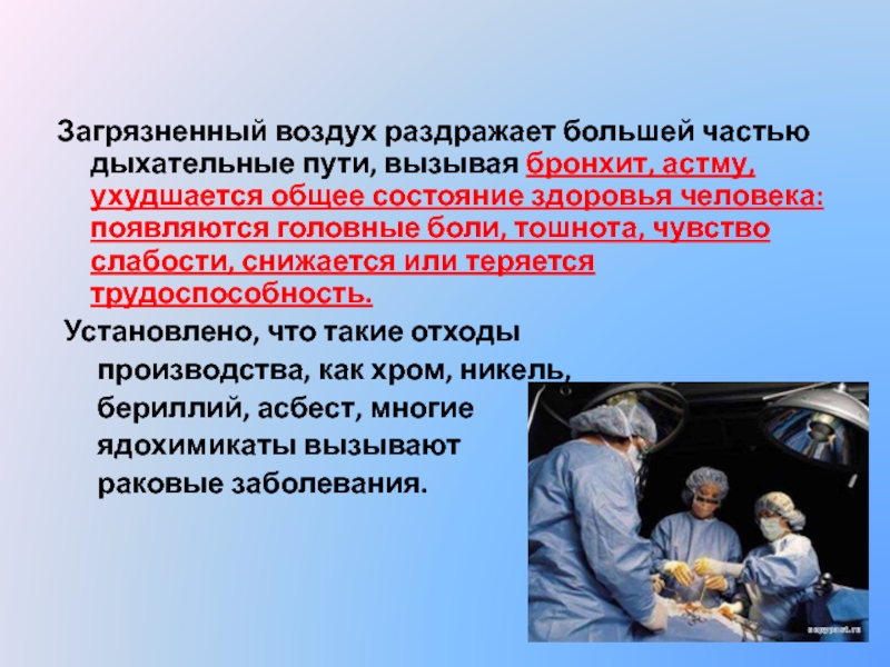 Слайд 4Загрязненный воздух раздражает большей частью дыхательные пути, вызывая бронхит, астму,