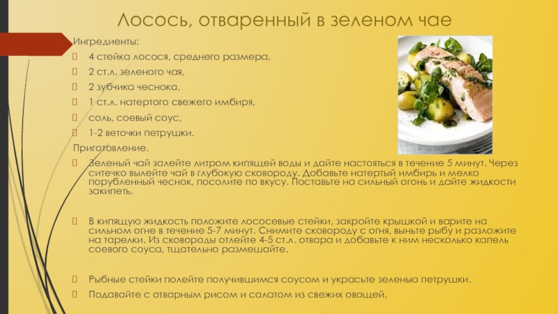В кипящую жидкость положите лососевые стейки, закройте крышкой и варите на сильном огне в течение 5-7 минут. Снимите сковороду с огня, выньте рыбу и разложите на тарелки. Из сковороды отлейте 4-5 ст.л. отвара и добавьте к ним несколько капель соевого соуса, тщательно размешайте.