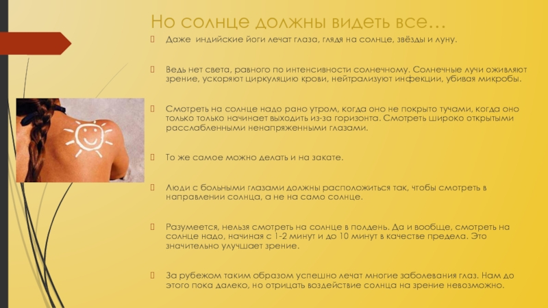 За рубежом таким образом успешно лечат многие заболевания глаз. Нам до этого пока далеко, но отрицать воздействие солнца на зрение невозможно.