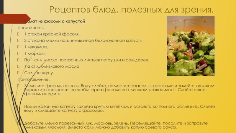 В капусте содержится масса витаминов: С и Р, В1, В2, РР. А также вещество холин. Витамином K также богат и шпинат. Особенно много витамина С содержится в квашеной капусте - куда больше, чем в тех же цитрусовых. Именно он помогает устранить хрупкость сосудиков (из-за того что они лопаются, краснеют глаза), улучшает кровообращение. Также полезен для образования коллагена, необходимого для регенерации глазных клеток и кровеносных сосудов. Сколько надо: не меньше 150 граммов три раза в неделю в любом виде - супах, салатах и просто так.