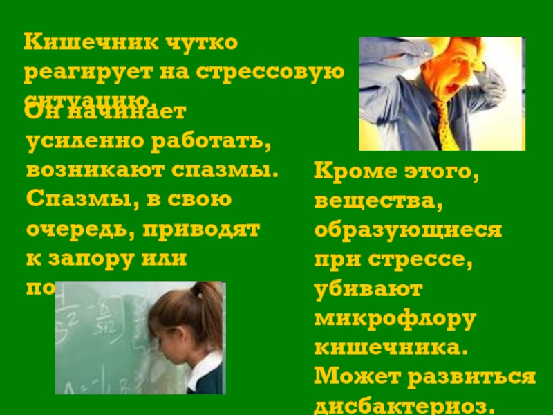 Кроме этого, вещества, образующиеся при стрессе, убивают микрофлору кишечника. Может развиться дисбактериоз.