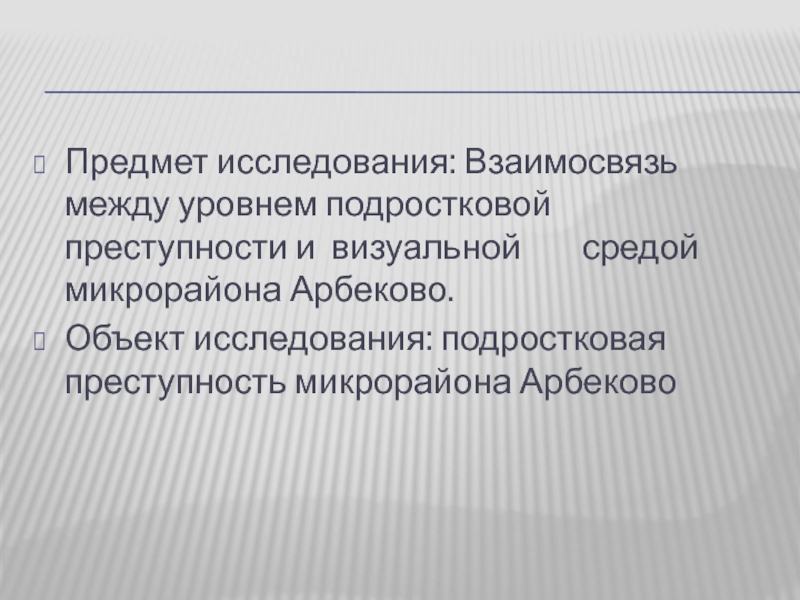 Предмет исследования: Взаимосвязь между уровнем подростковой преступности и визуальной    средой микрорайона Арбеково.Объект исследования: подростковая