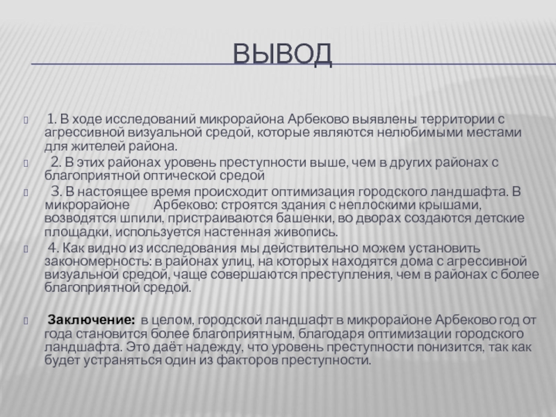 Заключение: в целом, городской ландшафт в микрорайоне Арбеково год от года становится более благоприятным, благодаря оптимизации городского ландшафта. Это даёт надежду, что уровень преступности понизится, так как будет устраняться один из факторов преступности.
