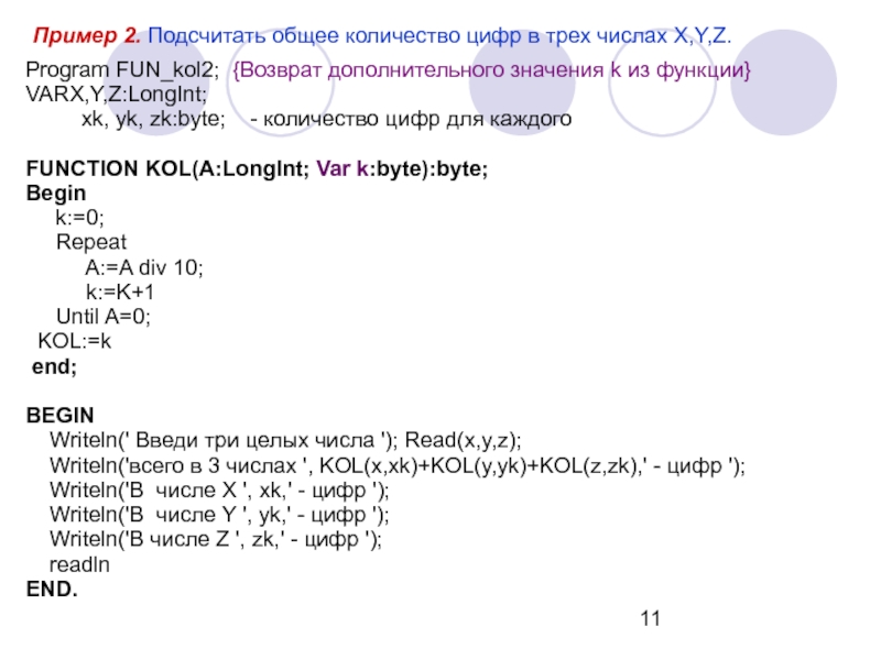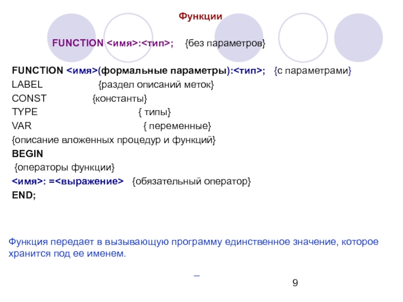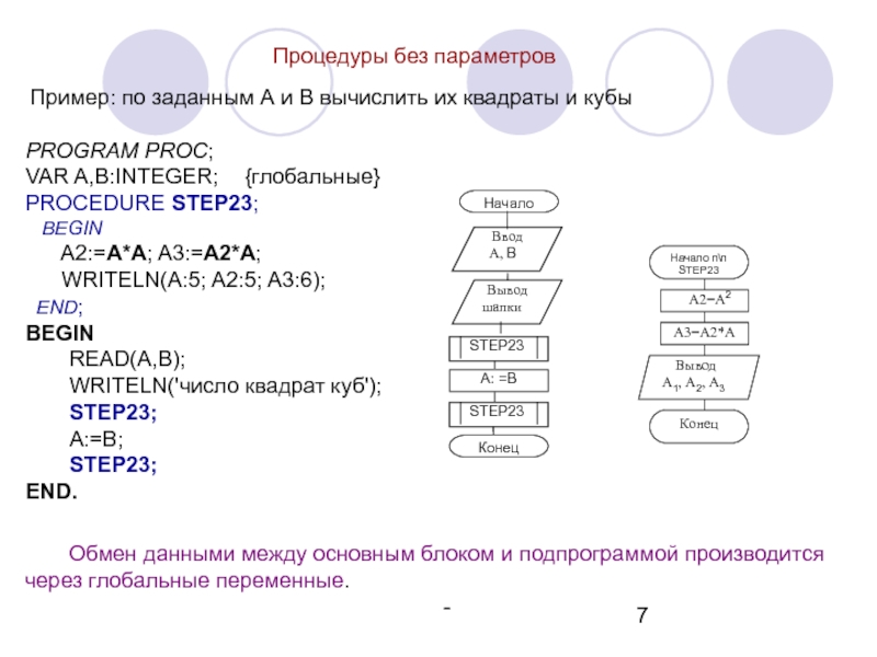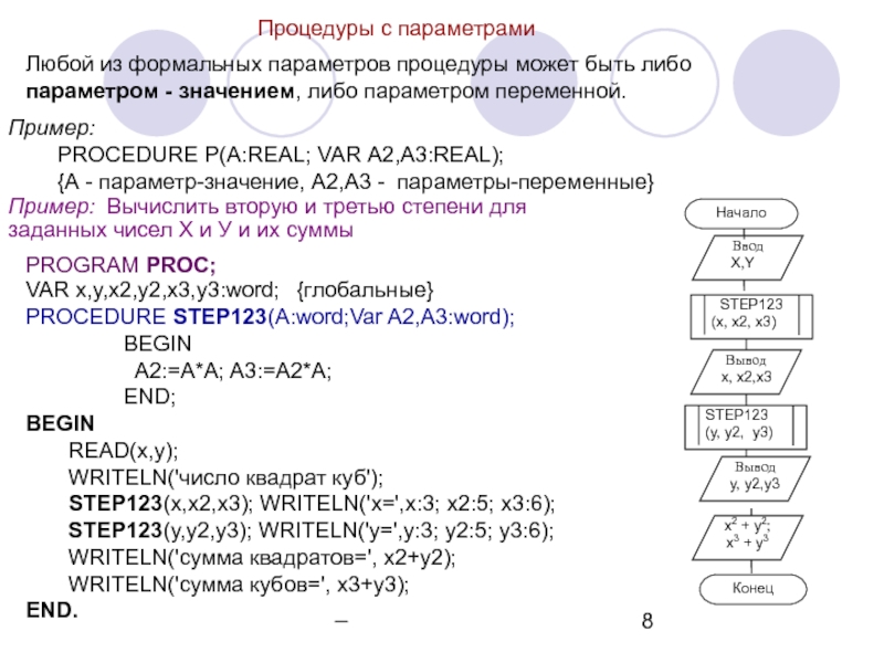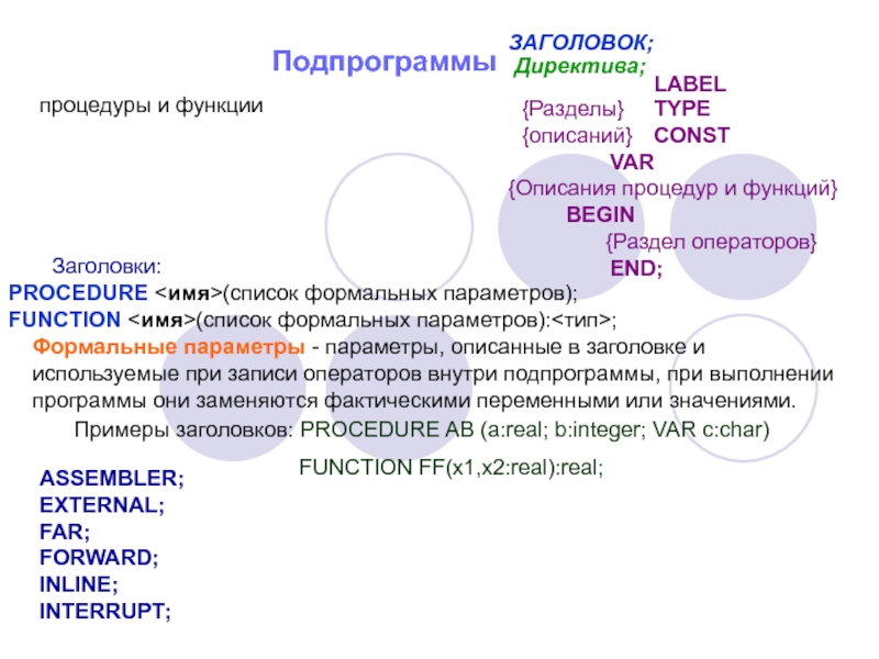 Примеры заголовков: PROCEDURE AB (a:real; b:integer; VAR c:char)