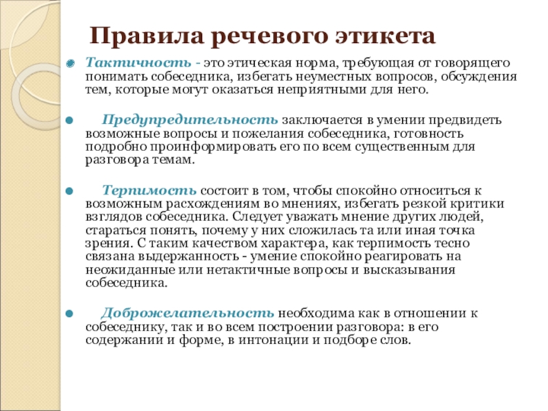 Предупредительность заключается в умении предвидеть возможные вопросы и пожелания собеседника, готовность подробно проинформировать его по всем существенным для разговора темам.