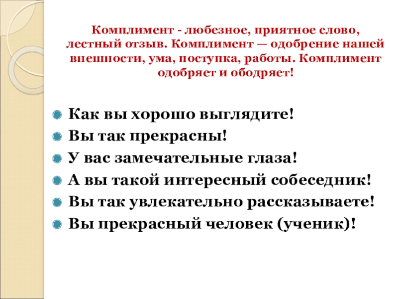 нашей внешности, ума, поступка, работы. Комплимент одобряет и ободряет!