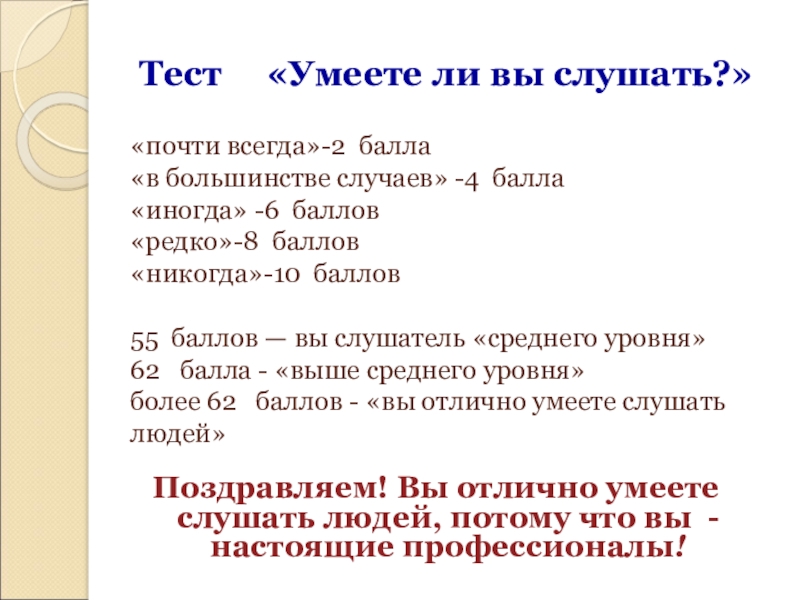Поздравляем! Вы отлично умеете слушать людей, потому что вы - настоящие профессионалы!