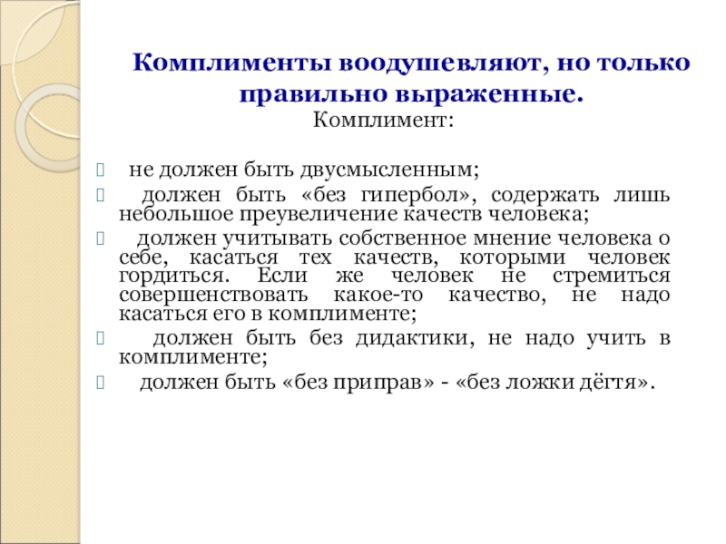 должен учитывать собственное мнение человека о себе, касаться тех качеств, которыми человек гордиться. Если же человек не стремиться совершенствовать какое-то качество, не надо касаться его в комплименте;