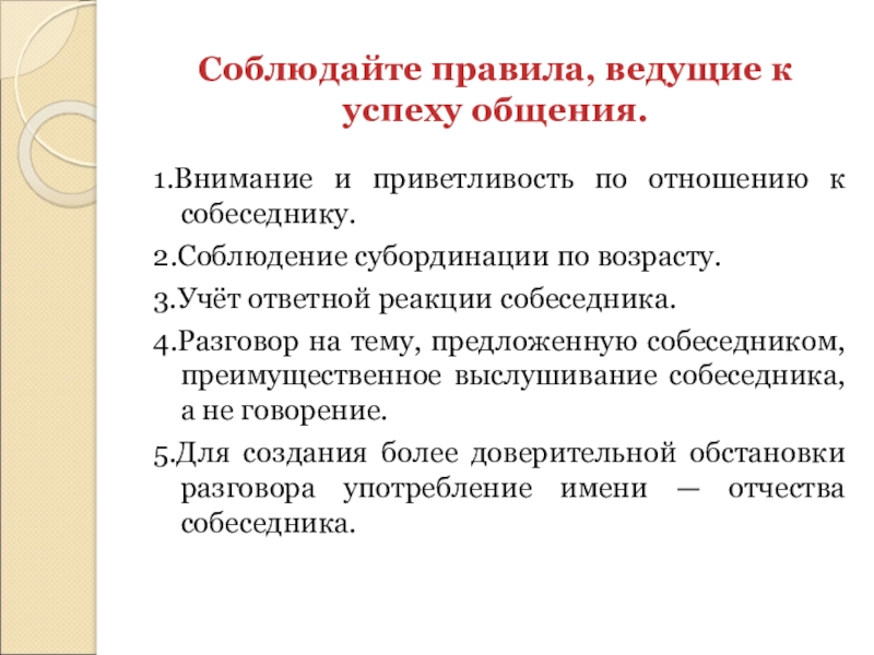 Доброжелательность необходима как в отношении к собеседнику, так и во всем построении разговора: в его содержании и форме, в интонации и подборе слов.
