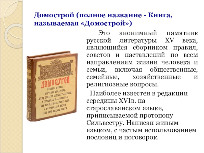 Слайд 13Домострой (полное название - Книга, называемая «Домострой»)