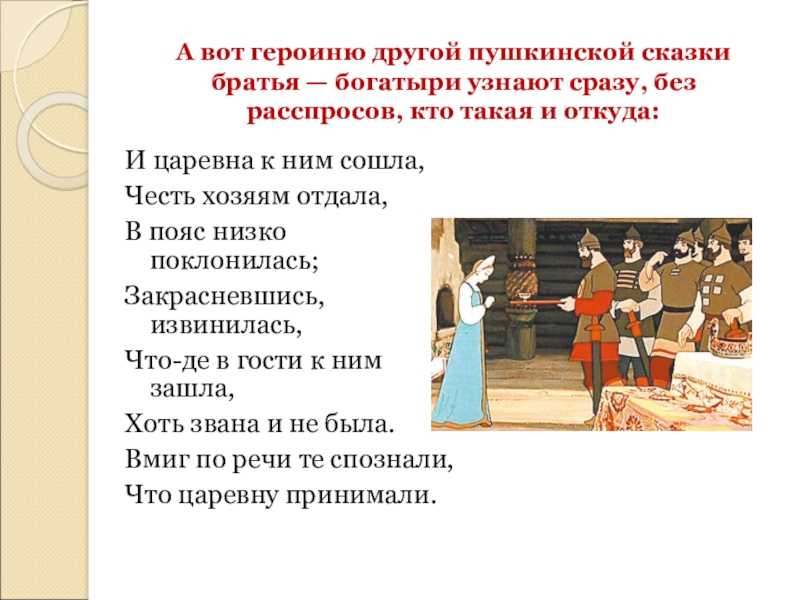 А вот героиню другой пушкинской сказки братья — богатыри узнают
