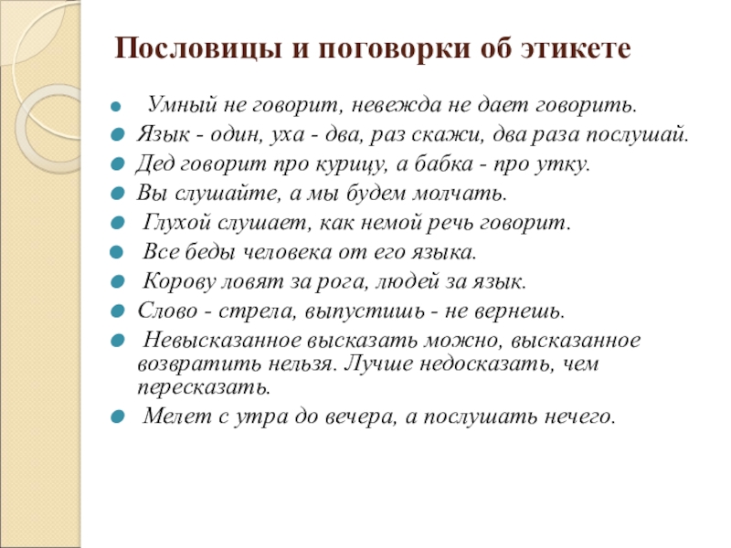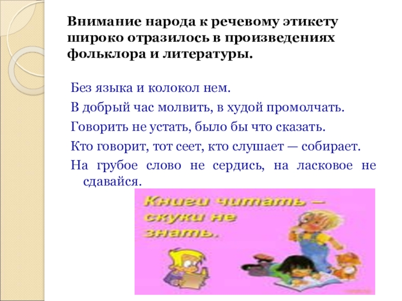 Слайд 15Внимание народа к речевому этикету широко отразилось в произведениях фольклора